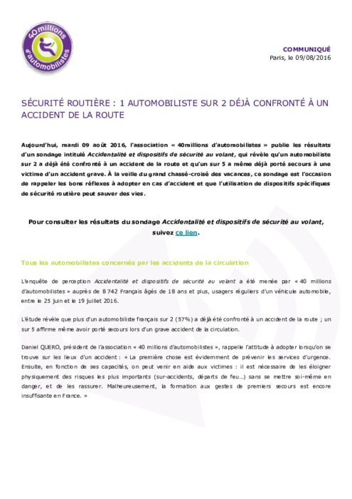 L'enquête de perception Accidentalité et dispositifs de sécurité au volant a été menée par « 40 millions d'automobilistes » auprès de 8 742 Français âgés de 18 ans et plus, usagers réguliers d'un véhicule automobile, entre le 25 juin et le 19 juillet 2016. L'étude révèle que plus d'un automobiliste français sur 2 (57%) a déjà été confronté à un accident de la route ; un sur 5 affirme même avoir porté secours lors d'un grave accident de la circulation.