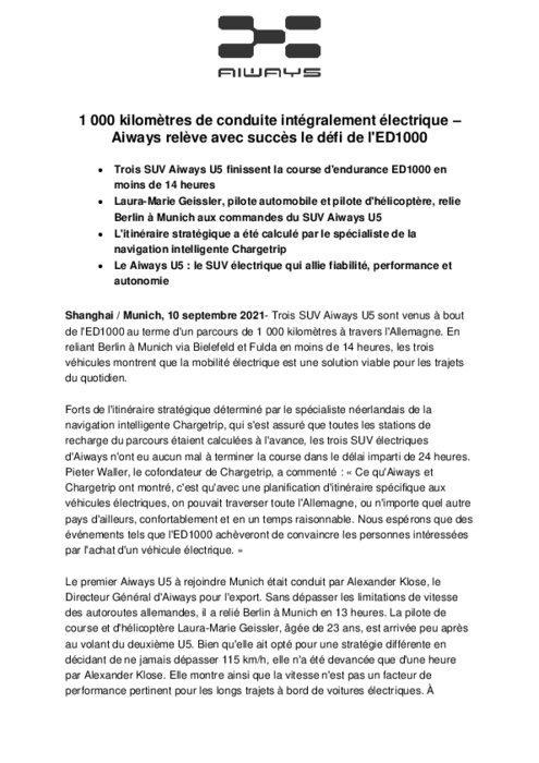 Trois SUV Aiways U5 sont venus à bout de l'ED1000 au terme d'un parcours de 1 000 kilomètres à travers l'Allemagne. En reliant Berlin à Munich via Bielefeld et Fulda en moins de 14 heures, les trois véhicules montrent que la mobilité électrique est une solution viable pour les trajets du quotidien.