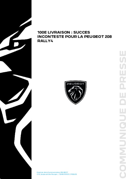 Tout juste un an après sa première commercialisation, le 100e exemplaire de la PEUGEOT 208 Rally4 va être livré cette semaine au Pérou. Le succès du nouveau " best-seller " de PEUGEOT Sport ne s’est pas fait attendre avec notamment les titres de Champion de France Terre et de Champion d’Italie en deux roues motrices...