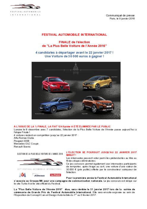 Lancée le 8 décembre avec 7 candidates, l’élection de la Plus Belle Voiture de l’Année passe à l'étape Finale ! 4 voitures restent en compétition jusqu'au 22 janvier 2017 : Alfa Romeo Giulia, Peugeot 3008, Mercedes GLC, Coupé Renault Scenic. La "Plus Belle Voiture de l'Année 2016" élue, sera révélée le 31 janvier 2017 lors de la soirée de cérémonie de Grands Prix du Festival Automobile International.