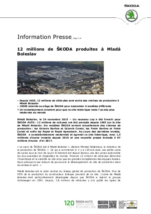 Un nouveau cap a été franchi pour ŠKODA AUTO : 12 millions de voitures ont été produits depuis 1905 sur le site de Mladá Boleslav. Six modèles ŠKODA sortent actuellement des chaines de production : les Octavia Berline et Octavia Combi, les Fabia Berline et Fabia Combi et enfin les Rapid et Rapid Spaceback. Au cours des dernières années, ŠKODA a considérablement modernisé et agrandi ce site historique, avec 1,5 milliards d’euros investis depuis 2010.