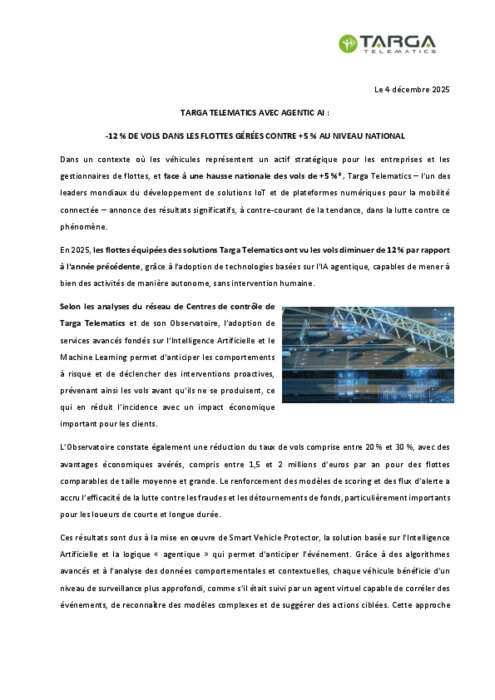 Dans un contexte où les véhicules représentent un actif stratégique pour les entreprises et les gestionnaires de flottes, et face à une hausse nationale des vols de +5 %*, Targa Telematics – l’un des leaders mondiaux du développement de solutions IoT et de plateformes numériques pour la mobilité connectée – annonce des résultats significatifs, à contre-courant de la tendance, dans la lutte contre ce phénomène.