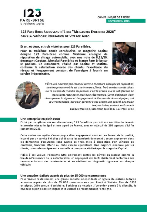 Et un, et deux, et trois victoires pour 123 Pare-Brise. Pour la troisième année consécutive, le magazine Capital désigne 123 Pare-Brise comme Meilleure enseigne de réparation de vitrage automobile, avec une note de 8,11/10, devançant Carglass, Mondial Pare-Brise et France Pare-Brise sur le podium. Ce classement, réalisé par Capital et Statista, confirme la satisfaction élevée des clients, l’excellence du réseau et l’engagement constant de l’enseigne à fournir un service irréprochable.