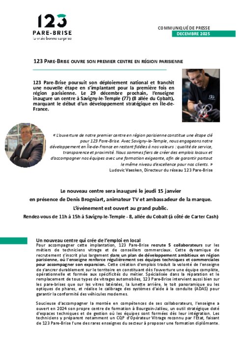 123 Pare-Brise poursuit son déploiement national et franchit une nouvelle étape en s’implantant pour la première fois en région parisienne. Le 29 décembre prochain, l’enseigne inaugure un centre à Savigny-le-Temple (77) (8 allée du Cobalt), marquant le début d’un développement stratégique en Île-de-France.