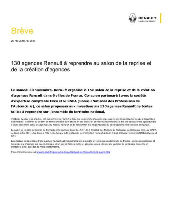 Le samedi 30 novembre, Renault organise le 15e salon de la reprise et de la création d’agences Renault dans 6 villes de France. Conçu en partenariat avec la société d’expertise comptable Exco et le CNPA (Conseil National des Professions de l’Automobile), ce salon proposera aux investisseurs 130 agences Renault de toutes tailles à reprendre sur l’ensemble du territoire national.