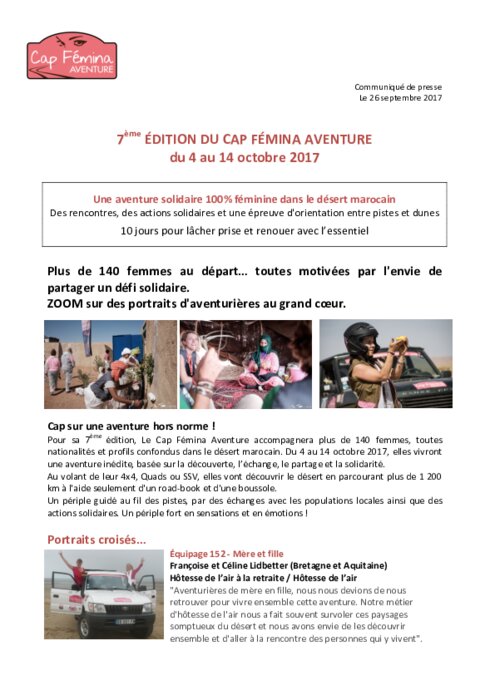 Pour sa 7ème édition, Le Cap Fémina Aventure accompagnera plus de 140 femmes, toutes nationalités et profils confondus dans le désert marocain. Du 4 au 14 octobre 2017, elles vivront une aventure inédite, basée sur la découverte, l'échange, le partage et la solidarité. Au volant de leur 4x4, Quads ou SSV, elles vont découvrir le désert en parcourant plus de 1 200 km à l'aide seulement d'un road-book et d'une boussole.