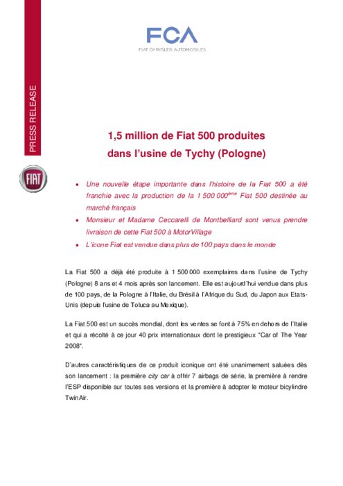 La Fiat 500 a déjà été produite à 1 500 000 exemplaires dans l’usine de Tychy (Pologne) 8 ans et 4 mois après son lancement. Elle est aujourd’hui vendue dans plus de 100 pays, de la Pologne à l’Italie, du Brésil à l’Afrique du Sud, du Japon aux Etats-Unis (depuis l’usine de Toluca au Mexique).