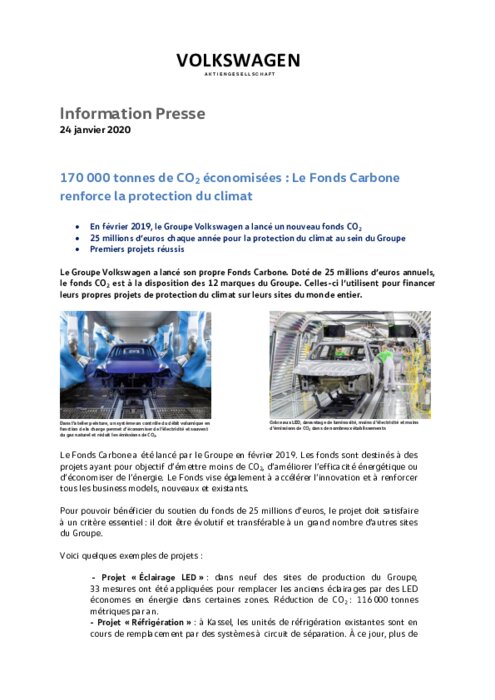 Le Groupe Volkswagen a lancé son propre Fonds Carbone. Doté de 25 millions d'euros annuels, le fonds CO2 est à la disposition des 12 marques du Groupe. Celles-ci l'utilisent pour financer leurs propres projets de protection du climat sur leurs sites du monde entier.