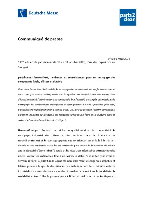 Dans tous les secteurs industriels, le nettoyage des composants est un facteur essentiel pour une fabrication stable, axée sur la qualité. Du 11 au 13 octobre, le salon parts2clean présente les pistes de solutions, les tendances et le savoir-faire en la matière dans le cadre du Parc des Expositions de Stuttgart.