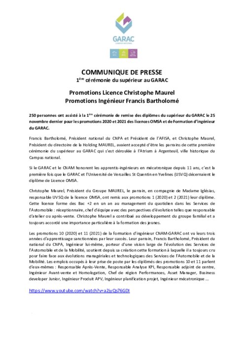 250 personnes ont assisté à la 1ère cérémonie de remise des diplômes du supérieur du GARAC le 25 novembre dernier pour les promotions 2020 et 2021 des licences OMSA et de Formation d’ingénieur du GARAC. Francis Bartholomé, Président national du CNPA et Président de l’AFISA, et Christophe Maurel, Président du directoire de la Holding MAUREL, avaient accepté d’être les parrains de cette première cérémonie du supérieur au GARAC qui s’est déroulée à l’Atrium à Argenteuil...