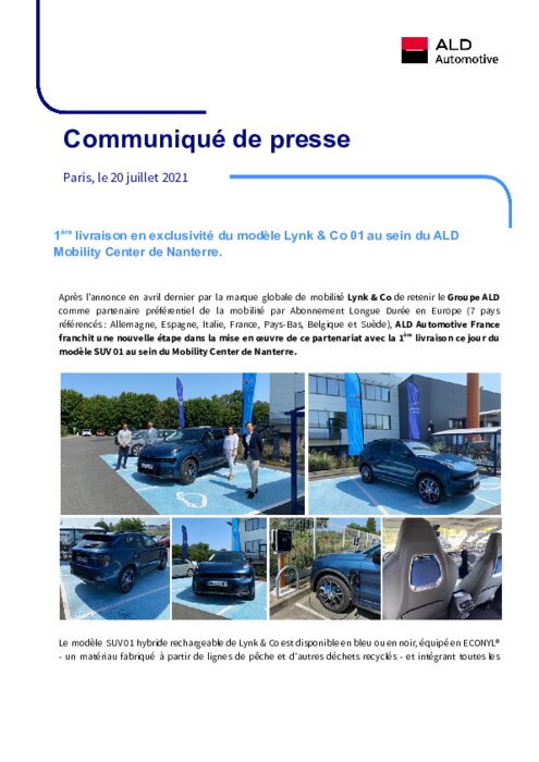 Après l’annonce en avril dernier par la marque globale de mobilité Lynk & Co de retenir le Groupe ALD comme partenaire préférentiel de la mobilité par Abonnement Longue Durée en Europe (7 pays référencés : Allemagne, Espagne, Italie, France, Pays-Bas, Belgique et Suède), ALD Automotive France franchit une nouvelle étape dans la mise en œuvre de ce partenariat avec la 1ère livraison ce jour du modèle SUV 01 au sein du Mobility Center de Nanterre.