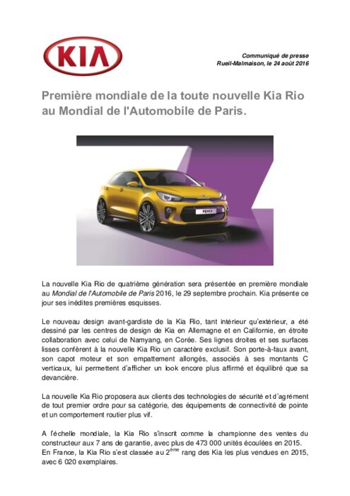 La nouvelle Kia Rio de quatrième génération sera présentée en première mondiale au Mondial de l'Automobile de Paris 2016, le 29 septembre prochain. Kia présente ce jour ses inédites premières esquisses. Le nouveau design avant-gardiste de la Kia Rio, tant intérieur qu’extérieur, a été dessiné par les centres de design de Kia en Allemagne et en Californie, en étroite collaboration avec celui de Namyang, en Corée.