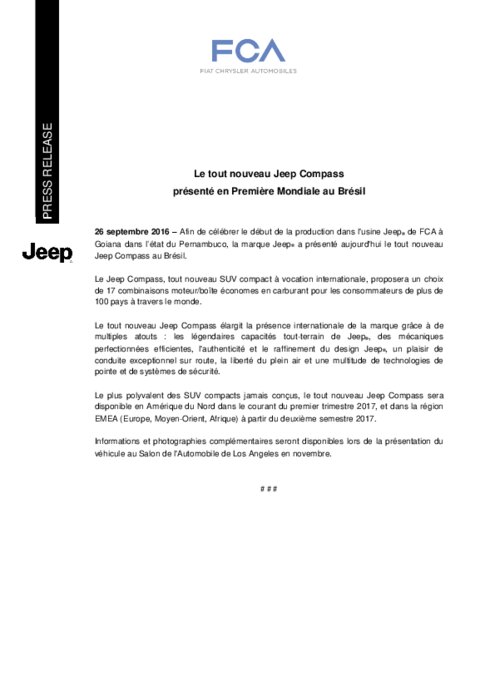 Afin de célébrer le début de la production dans l'usine Jeep de FCA à Goiana dans l’état du Pernambuco, la marque Jeep a présenté lundi 26 septembre le tout nouveau Jeep Compass au Brésil. Le Jeep Compass, tout nouveau SUV compact à vocation internationale, proposera un choix de 17 combinaisons moteur/boîte économes en carburant pour les consommateurs de plus de 100 pays à travers le monde.