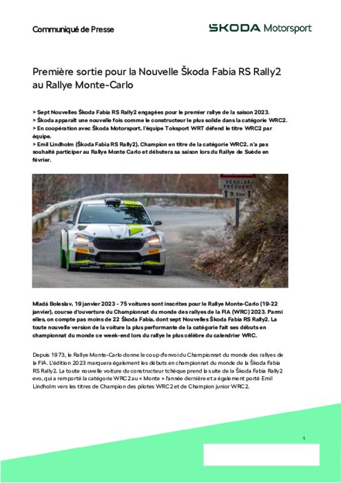 75 voitures sont inscrites pour le Rallye Monte-Carlo (19-22 janvier), course d'ouverture du Championnat du monde des rallyes de la FIA (WRC) 2023. Parmi elles, on compte pas moins de 22 Škoda Fabia, dont sept Nouvelles Škoda Fabia RS Rally2. La toute nouvelle version de la voiture la plus performante de la catégorie fait ses débuts en championnat du monde ce week-end lors du rallye le plus célèbre du calendrier WRC.