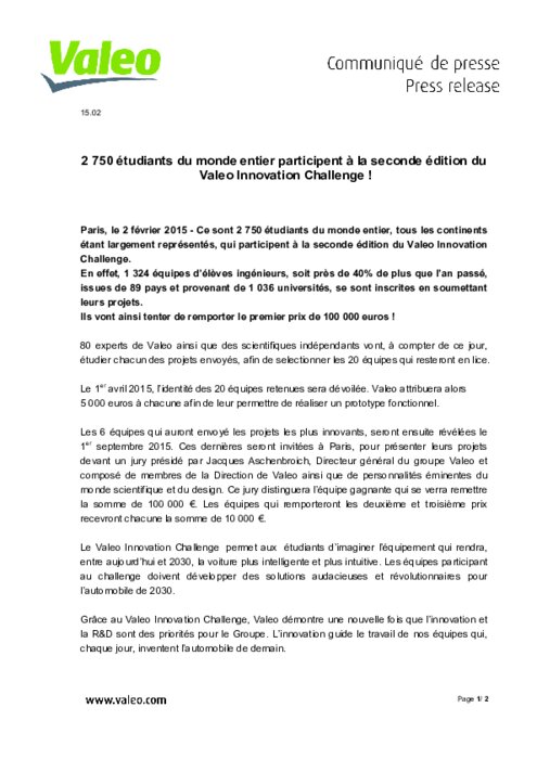 Ce sont 2 750 étudiants du monde entier, tous les continents étant largement représentés, qui participent à la seconde édition du Valeo Innovation Challenge. En effet, 1 324 équipes d’élèves ingénieurs, soit près de 40% de plus que l’an passé, issues de 89 pays et provenant de 1 036 universités, se sont inscrites en soumettant leurs projets. Ils vont ainsi tenter de remporter le premier prix de 100 000 euros !