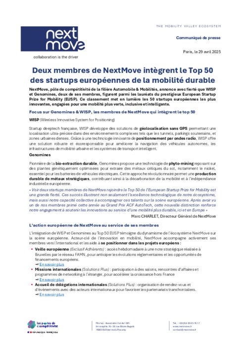 NextMove, pôle de compétitivité de la filière Automobile & Mobilités, annonce avec fierté que WISP et Genomines, deux de ses membres, figurent parmi les lauréats du prestigieux European Startup Prize for Mobility (EUSP). Ce classement met en lumière les 50 startups européennes les plus innovantes, engagées pour une mobilité plus verte, inclusive et intelligente.