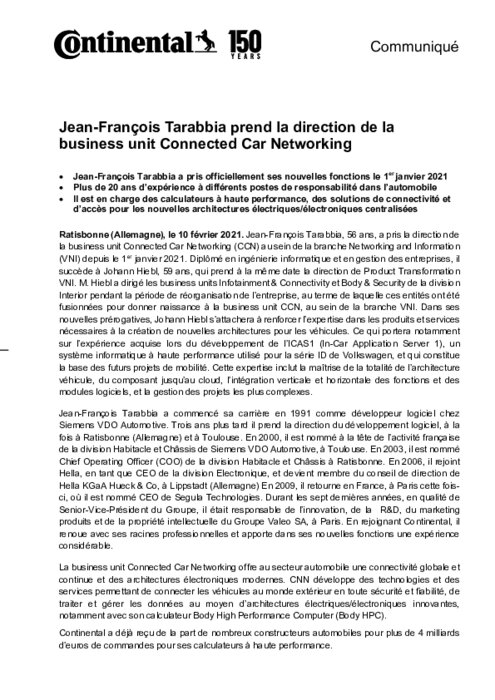 Jean-François Tarabbia, 56 ans, a pris la direction de la business unit Connected Car Networking (CCN) au sein de la branche Networking and Information (VNI) depuis le 1er janvier 2021. Diplômé en ingénierie informatique et en gestion des entreprises, il succède à Johann Hiebl, 59 ans, qui prend à la même date la direction de Product Transformation VNI...