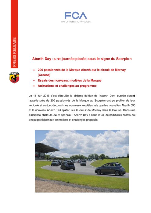 Le 18 juin 2016 s’est déroulée la sixième édition de l’Abarth Day, journée durant laquelle près de 200 passionnés de la Marque au Scorpion ont pu profiter de leur véhicule et surtout découvrir les nouveaux modèles tels que les nouvelles Abarth 595 et le nouveau Abarth 124 spider, sur le circuit de Mornay dans la Creuse. Dans une ambiance chaleureuse et sportive, l’Abarth Day a donc réuni de nombreux clients qui ont pu participer aux animations et challenges proposés.