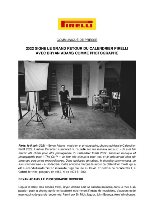Bryan Adams, musicien et photographe, photographiera le Calendrier Pirelli 2022. L’artiste Canadien a annoncé la nouvelle sur ses réseaux sociaux. « Je suis fier d’avoir été choisi pour être photographe du Calendrier Pirelli 2022. Associer musique et photographie pour « The Cal™ » va être très stimulant pour moi, et je collaborerai bien sûr avec des personnes extraordinaires. Dans quelques semaines, le shooting commencera.
