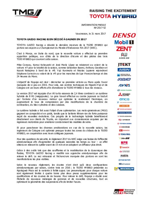 TOYOTA GAZOO Racing a dévoilé la dernière mouture de la TS050 HYBRID qui portera ses espoirs au Championnat du Monde d’Endurance FIA 2017 (WEC). C’est à Monza, en Italie du nord, que la nouvelle voiture a effectué sa première apparition publique, aux côtés de la direction d’écurie et des pilotes des trois TS50 HYBRID qui courront cette saison.