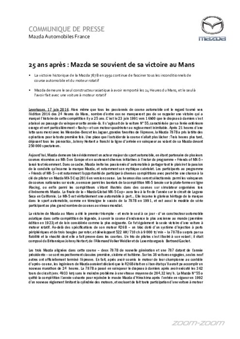 La victoire historique de la Mazda 787B en 1991 continue de fasciner tous les inconditionnels de course automobile et du moteur rotatif. Mazda demeure le seul constructeur asiatique à avoir remporté les 24 Heures du Mans, et le seul à l’avoir fait avec une voiture à moteur rotatif.