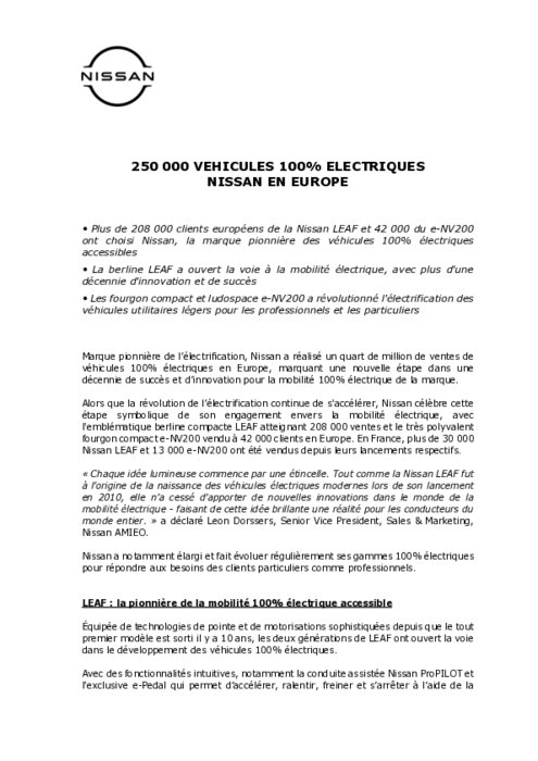 Marque pionnière de l'électrification, Nissan a réalisé un quart de million de ventes de véhicules 100% électriques en Europe, marquant une nouvelle étape dans une décennie de succès et d'innovation pour la mobilité 100% électrique de la marque. Alors que la révolution de l'électrification continue de s'accélérer, Nissan célèbre cette étape symbolique de son engagement envers la mobilité électrique, avec l'emblématique berline compacte LEAF atteignant 208 000 ventes...