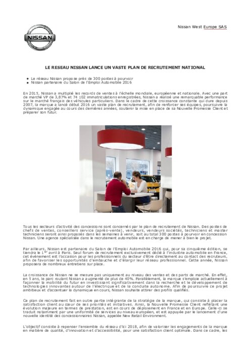 En 2015, Nissan a multiplié les records de ventes à l’échelle mondiale, européenne et nationale. Avec une part de marché VP de 3,87% et 74 102 immatriculations enregistrées, Nissan a réalisé une remarquable performance sur le marché français des véhicules particuliers. Dans le cadre de cette croissance constante qui dure depuis 2007, la marque a lancé début 2016 un vaste plan de recrutement, afin de renforcer ses équipes, poursuivre la dynamique engagée au cours des dernières années...