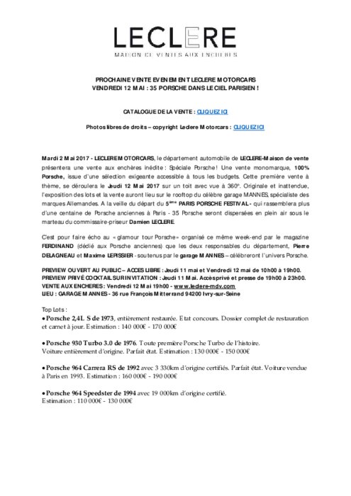 LECLERE MOTORCARS, le département automobile de LECLERE-Maison de vente présentera une vente aux enchères inédite : Spéciale Porsche ! Une vente monomarque, 100% Porsche, issue d’une sélection exigeante accessible à tous les budgets. Cette première vente à thème, se déroulera le Jeudi 12 Mai 2017 sur un toit avec vue à 360°. Originale et inattendue, l’exposition des lots et la vente auront lieu sur le rooftop du célèbre garage MANNES, spécialiste des marques Allemandes.