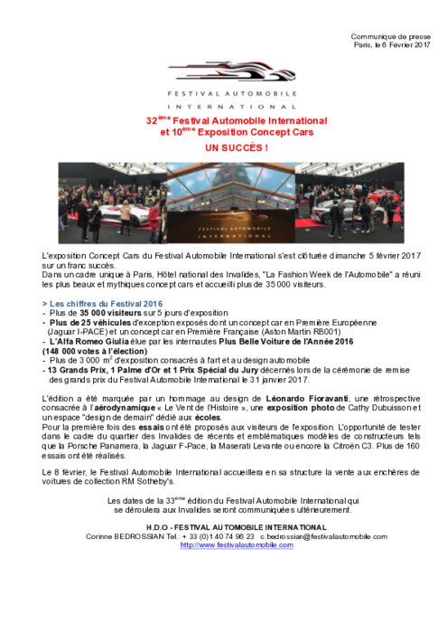 L'exposition Concept Cars du Festival Automobile International s'est clôturée dimanche 5 février 2017 sur un franc succès. Dans un cadre unique à Paris, Hôtel national des Invalides, "La Fashion Week de l'Automobile" a réuni les plus beaux et mythiques concept cars et accueilli plus de 35 000 visiteurs.