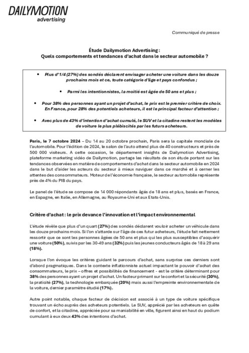 Du 14 au 20 octobre prochain, Paris sera la capitale mondiale de l’automobile. Pour l’édition de 2024, le salon de l’auto attend plus de 40 constructeurs et près de 500 000 visiteurs. A cette occasion, le département insights de Dailymotion Advertising, plateforme marketing vidéo de Dailymotion, partage les résultats de son étude portant sur les tendances observées en matière de comportements d’achat dans le secteur automobile en 2024 dans le but d’aider les acteurs du secteur à mieux naviguer dans ce marché et à cerner les attentes des consommateurs.