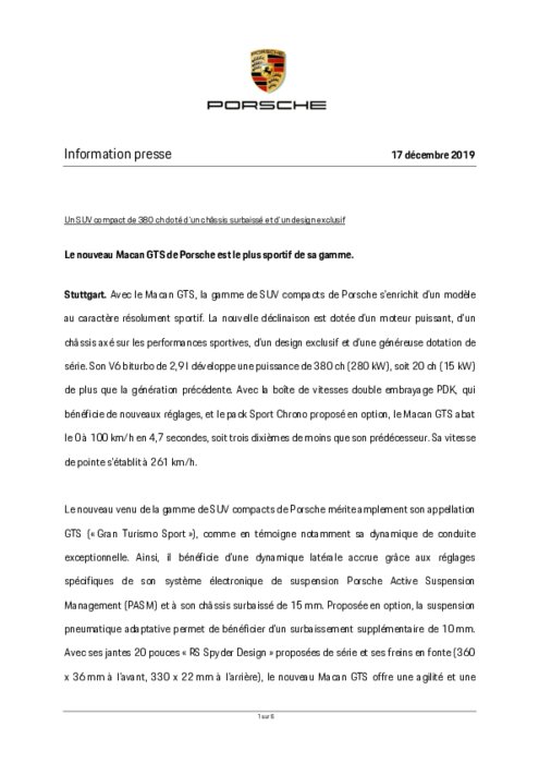 Avec le Macan GTS, la gamme de SUV compacts de Porsche s'enrichit d'un modèle au caractère résolument sportif. La nouvelle déclinaison est dotée d'un moteur puissant, d'un châssis axé sur les performances sportives, d'un design exclusif et d'une généreuse dotation de série. Son V6 biturbo de 2,9 l développe une puissance de 380 ch (280 kW), soit 20 ch (15 kW) de plus que la génération précédente...
