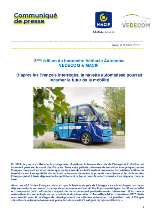 3ème édition du baromètre Véhicule Autonome VEDECOM & MACIF