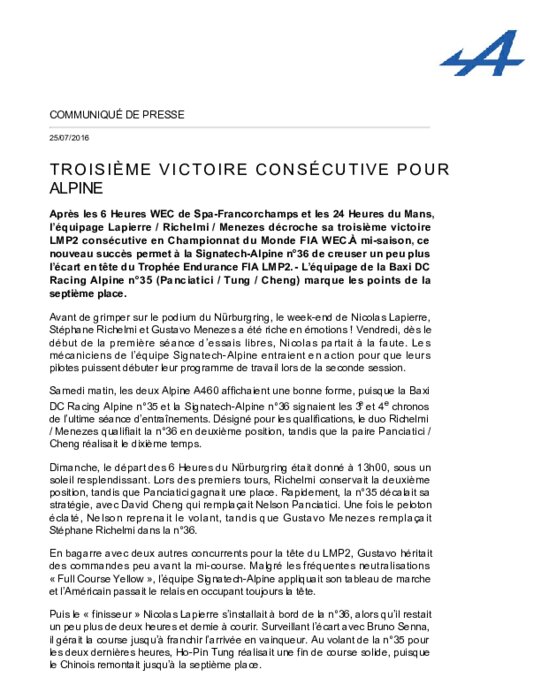 Après les 6 Heures WEC de Spa-Francorchamps et les 24 Heures du Mans, l’équipage Lapierre / Richelmi / Menezes décroche sa troisième victoire LMP2 consécutive en Championnat du Monde FIA WEC. À mi-saison, ce nouveau succès permet à la Signatech-Alpine n°36 de creuser un peu plus l’écart en tête du Trophée Endurance FIA LMP2. - L’équipage de la Baxi DC Racing Alpine n°35 (Panciatici / Tung / Cheng) marque les points de la septième place.