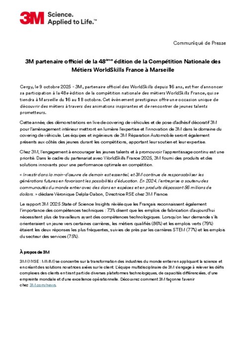 3M, partenaire officiel des WorldSkills depuis 16 ans, est fier d'annoncer sa participation à la 48e édition de la compétition nationale des métiers WorldSkills France, qui se tiendra à Marseille du 16 au 18 octobre. Cet événement prestigieux offre une occasion unique de découvrir des métiers à travers des animations inspirantes et de rencontrer de jeunes talents prometteurs.