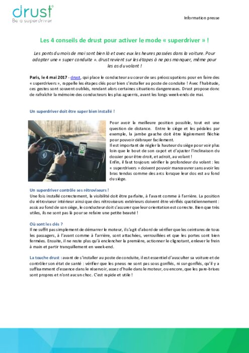 Drust, qui place le conducteur au cœur de ses préoccupations pour en faire des " superdrivers ", rappelle les étapes clés pour bien s’installer au poste de conduite ! Avec l’habitude, ces gestes sont souvent oubliés, rendant alors certaines situations dangereuses. Drust propose donc de rafraîchir la mémoire des conducteurs les plus aguerris, avant les longs week-ends de mai.