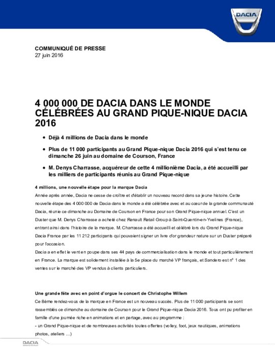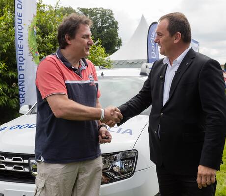 Déjà 4 millions de Dacia dans le monde - Plus de 11 000 participants au Grand Pique­nique Dacia 2016 qui s’est tenu ce dimanche 26 juin au domaine de Courson, France - M. Denys Charrasse, acquéreur de cette 4 millionième Dacia, a été accueilli par les milliers de participants réunis au Grand Pique­nique.