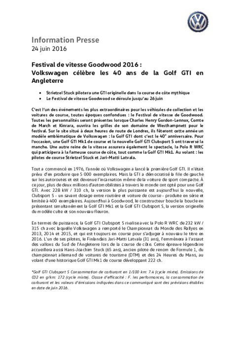 C’est l’un des événements les plus extraordinaires pour les véhicules de collection et les voitures de course, toutes époques confondues : le Festival de vitesse de Goodwood. Toutes les personnalités seront présentes lorsque Charles Henry Gordon-Lennox, Comte de March et Kinrara, ouvrira les grilles de son domaine de Westhampnett pour le festival. Sur le site situé à 2 heures de route de Londres, ils fêteront un modèle emblématique de Volkswagen : la Golf GTI dont c’est le 40e anniversaire.
