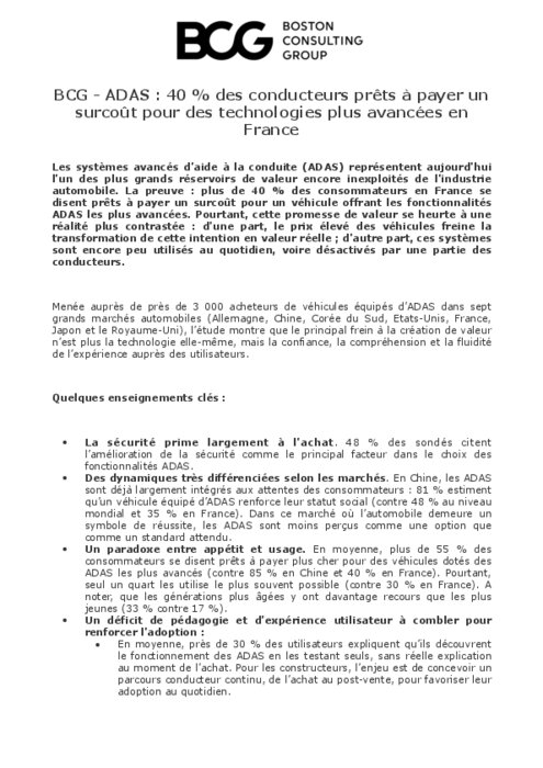 Les systèmes avancés d’aide à la conduite (ADAS) représentent aujourd’hui l’un des plus grands réservoirs de valeur encore inexploités de l’industrie automobile. La preuve : plus de 40 % des consommateurs en France se disent prêts à payer un surcoût pour un véhicule offrant les fonctionnalités ADAS les plus avancées. Pourtant, cette promesse de valeur se heurte à une réalité plus contrastée : d’une part, le prix élevé des véhicules freine la transformation de cette intention en valeur réelle ; d’autre part, ces systèmes sont encore peu utilisés au quotidien, voire désactivés par une partie des conducteurs.