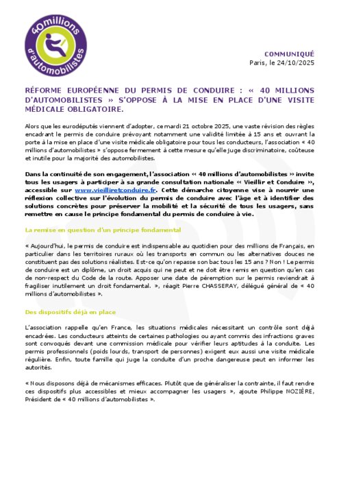Dans la continuité de son engagement, l’association « 40 millions d’automobilistes » invite tous les usagers à participer à sa grande consultation nationale «Vieillir et Conduire », accessible sur www.vieilliretconduire.fr. Cette démarche citoyenne vise à nourrir une réflexion collective sur l’évolution du permis de conduire avec l’âge et à identifier des solutions concrètes pour préserver la mobilité et la sécurité de tous les usagers, sans remettre en cause le principe fondamental du permis de conduire à vie.