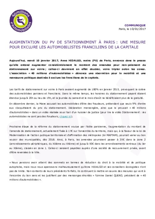Mardi 10 janvier 2017, Anne HIDALGO, maire (PS) de Paris, annonce dans la presse qu’elle entend augmenter considérablement le montant des amendes pour non-paiement du stationnement sur voirie ; celles-ci devraient en effet doubler, voire tripler selon les zones. L’association " 40 millions d’automobilistes " dénonce une aberration pour la mobilité et une manœuvre politique destinée à exclure les franciliens de la capitale.