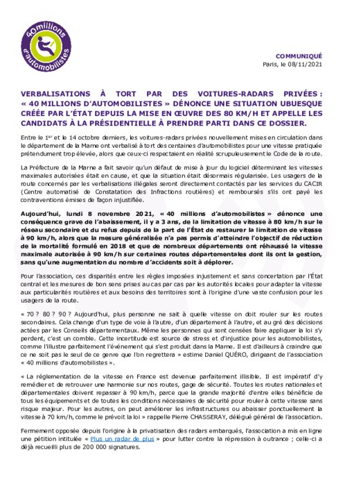 Lundi 8 novembre 2021, 40 MA dénonce une conséquence grave de l’abaissement, il y a 3 ans, de la limitation de vitesse à 80 km/h sur le réseau secondaire et du refus depuis de la part de l’État de restaurer la limitation de vitesse à 90 km/h, alors que la mesure généralisée n’a pas permis d’atteindre l’objectif de réduction de la mortalité formulé en 2018 et que de nombreux départements ont réhaussé la vitesse maximale autorisée à 90 km/h sur certaines routes départementales...