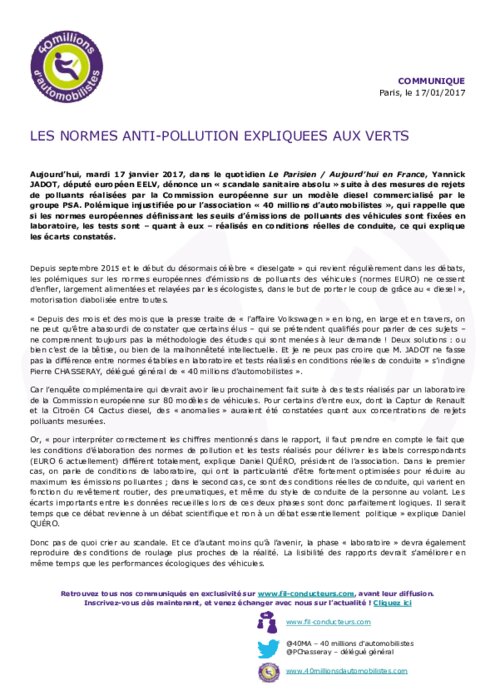 Mardi 17 janvier 2017 dans le quotidien "Le Parisien/Aujourd’hui en France", Yannick JADOT, député européen EELV, dénonce un « scandale sanitaire absolu » suite à des mesures de rejets de polluants réalisées par la Commission européenne sur un modèle diesel commercialisé par le groupe PSA. Polémique injustifiée pour l’association « 40 millions d’automobilistes »...