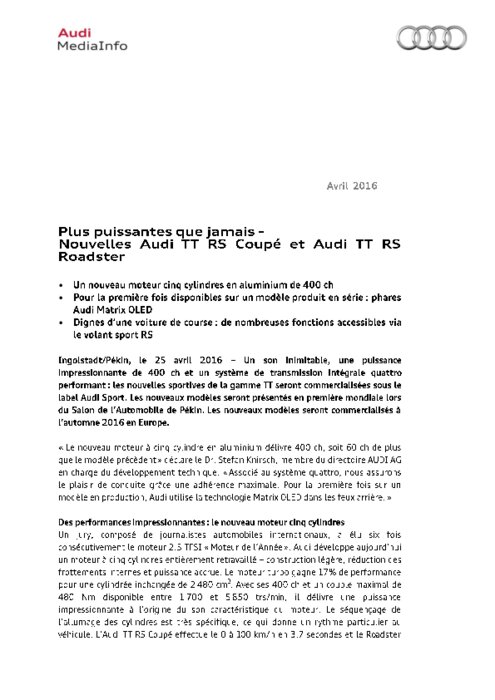Un son inimitable, une puissance impressionnante de 400 ch et un système de transmission intégrale quattro performant : les nouvelles sportives de la gamme TT seront commercialisées sous le label Audi Sport. Les nouveaux modèles seront présentés en première mondiale lors du Salon de l’Automobile de Pékin. Les nouveaux modèles seront commercialisés à l’automne 2016 en Europe.
