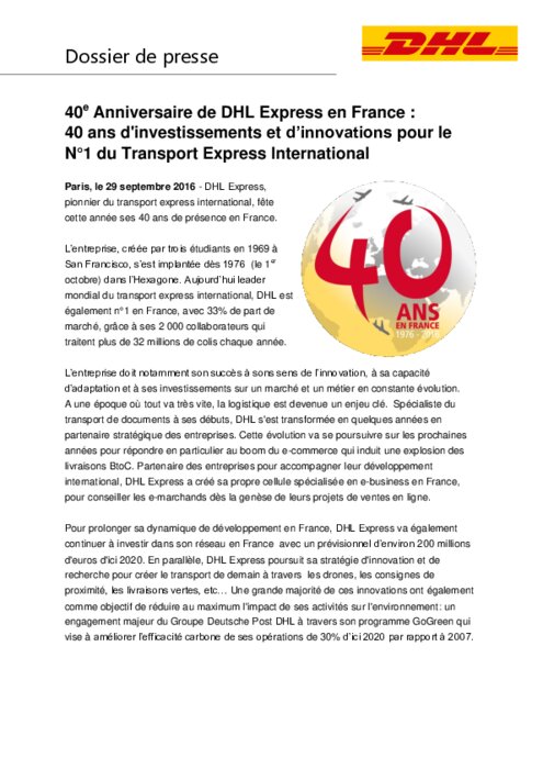 DHL Express, pionnier du transport express international, fête cette année ses 40 ans de présence en France. L’entreprise, créée par trois étudiants en 1969 à San Francisco, s’est implantée dès 1976 (le 1er octobre) dans l’Hexagone. Aujourd’hui leader mondial du transport express international, DHL est également n°1 en France, avec 33% de part de marché, grâce à ses 2 000 collaborateurs qui traitent plus de 32 millions de colis chaque année.