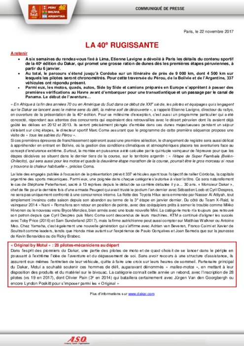 A six semaines du rendez-vous fixé à Lima, Etienne Lavigne a dévoilé à Paris les détails du contenu sportif de la 40e édition du Dakar, qui promet une grosse ration de dunes dès les premières étapes péruviennes, à partir du 6 janvier. Au total, le parcours s’étend jusqu’à Cordoba sur un itinéraire de près de 9 000 km, dont 4 500 km sur lesquels les pilotes seront chronométrés. Pour cette traversée du Pérou, de la Bolivie et de l’Argentine, 337 véhicules ont répondu présent.
