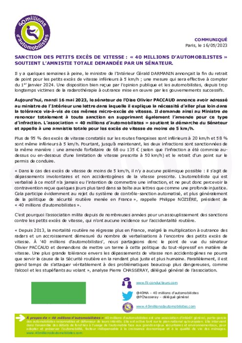 Le sénateur de l’Oise Olivier PACCAUD annonce avoir adressé au ministre de l’Intérieur une lettre dans laquelle il explique la nécessité d’aller plus loin dans la tolérance vis-à-vis de ces mêmes micro-excès de vitesse. Il demande ainsi au Ministre de renoncer totalement à toute sanction en supprimant également l’amende pour ce type d’infraction. L’association « 40 millions d’automobilistes » soutient la démarche du Sénateur et appelle à une amnistie totale.