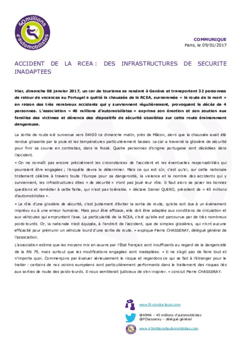 Dimanche 08 janvier 2017, un car de tourisme se rendant à Genève et transportant 32 personnes de retour de vacances au Portugal a quitté la chaussée de la RCEA, surnommée "la route de la mort " en raison des très nombreux accidents qui y surviennent régulièrement, provoquant le décès de 4 personnes. L'association "40 millions d'automobilistes" exprime son émotion et son soutien aux familles des victimes et dénonce des dispositifs de sécurité obsolètes sur cette route éminemment dangereuse.