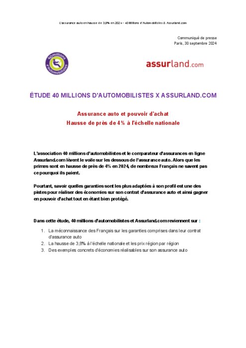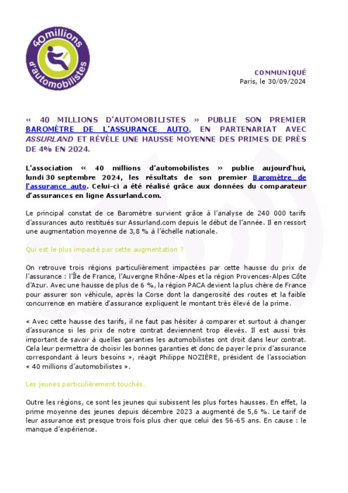 L’association « 40 millions d’automobilistes » publie les résultats de son premier Baromètre de l’assurance auto. Celui-ci a été réalisé grâce aux données du comparateur d’assurances en ligne Assurland.com. Le principal constat de ce Baromètre survient grâce à l’analyse de 240 000 tarifs d’assurances auto restitués sur Assurland.com depuis le début de l’année. Il en ressort une augmentation moyenne de 3,8 % à l’échelle nationale.