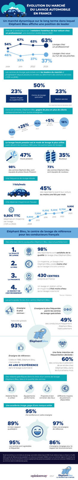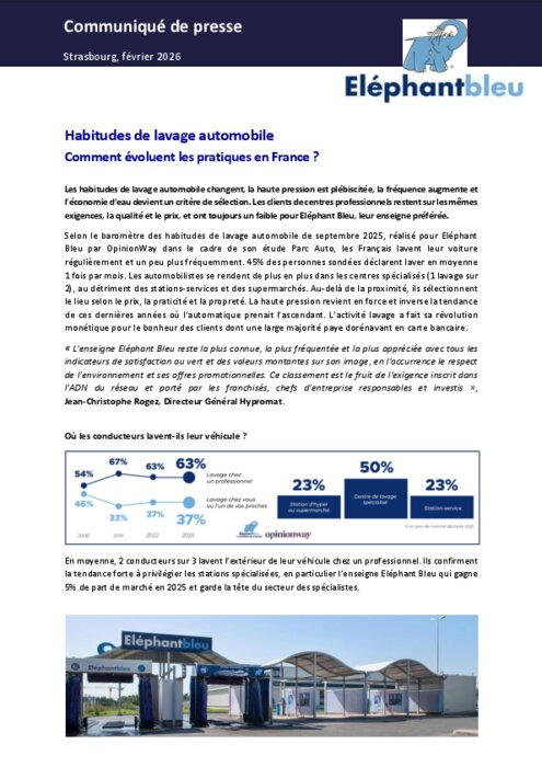 Services 02 février 2026 - 15:04 Les habitudes de lavage automobile des Français évoluent nettement, comme le montre le dernier baromètre OpinionWay pour Eléphant Bleu (septembre 2025). PDF (555 Ko) Télécharger credit Elephant Bleu