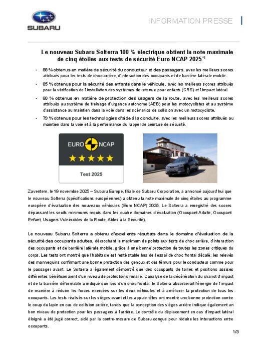 Subaru Europe, filiale de Subaru Corporation, a annoncé que le nouveau Solterra (spécifications européennes) a obtenu la note maximale de cinq étoiles au programme européen d’évaluation des nouveaux véhicules (Euro NCAP) 2025. Le Solterra a enregistré des scores dépassant les seuils minimums requis dans les quatre domaines d’évaluation (Occupant Adulte, Occupant Enfant, Usagers Vulnérables de la Route, Aides à la Sécurité).
